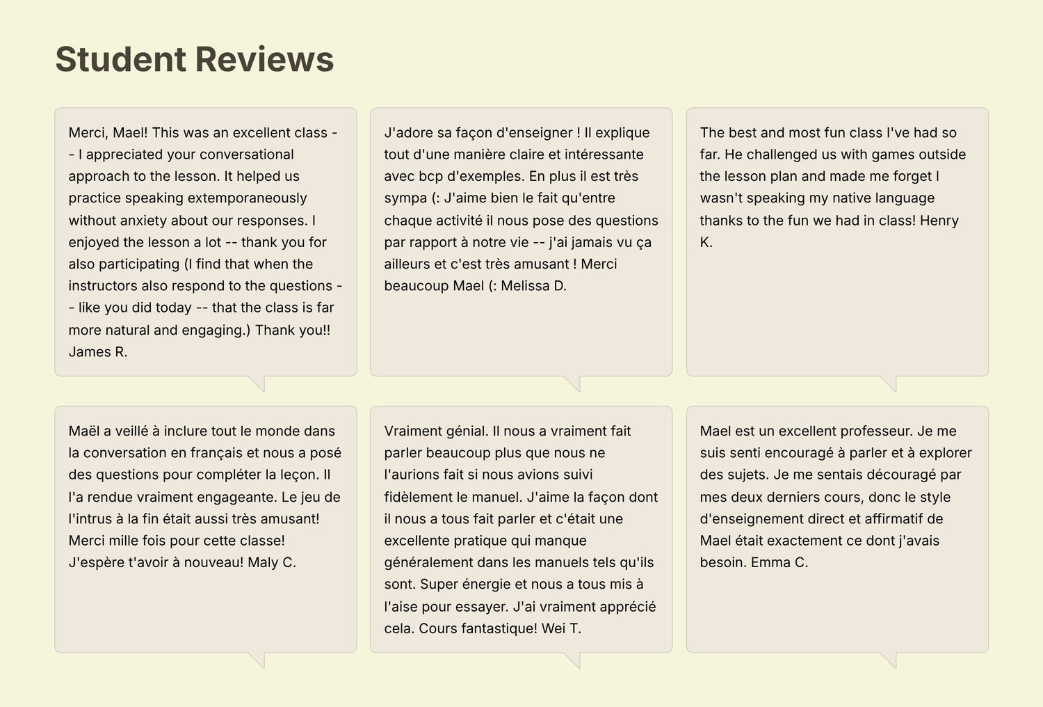 "Francofy completely changed my way of learning French. Thanks to the cultural approach, I not only improved my language level but also developed a true passion for French culture. The teachers are exceptional and the course format is perfectly adapted to my busy schedule."